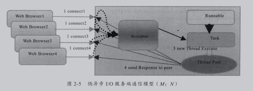 为了改进一线程一连接模型,后来演进出了一个通过线程池或者消息队列实现1个或者多个线程处理N个客户端的模型,由于它的底层通信机制依然是沿用同步阻塞I/O,所以被称为“伪异步”。