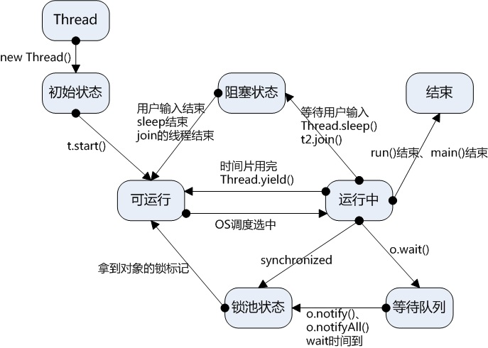 (三)、其他阻塞:运行的线程执行sleep()或join()方法,或者发出了I/O请求时,JVM会把该线程置为阻塞状态。当sleep()状态超时、join()等待线程终止或者超时、或者I/O 处理完毕时,线程重新转入就绪状态。(注意,sleep是不会释放持有的锁)