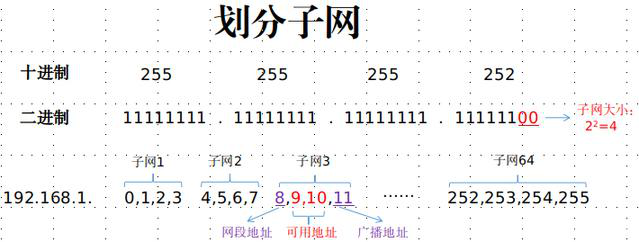 子网掩码255.255.255.252是怎么划分子网的。将该子网掩码转换成二进制为30个1和2个0,表示每个子网中只有4个IP地址(2的2次方),192.168.1.0-255的地址段共可划分64个子网,第一个子网的地址范围是192.168.1.0-192.168.1.3,第二个子网的地址范围是192.168.1.4-192.168.1.7,依次类推。其中每个子网第一个和最后一个IP地址不可用,可用的只有2个IP地址。也就是说:如果子网掩码设置为255.255.255.252,那么该子网只能容纳两台电脑,而且这两台电脑的IP必须在一个子网内才能正常联网,