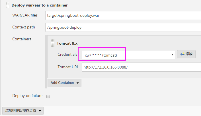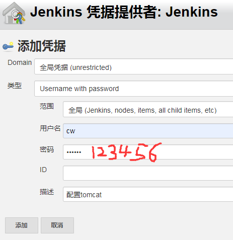 第一步:操作:点击添加按钮,点击jenkins,配置 (username="cw" password="123456") 如下图