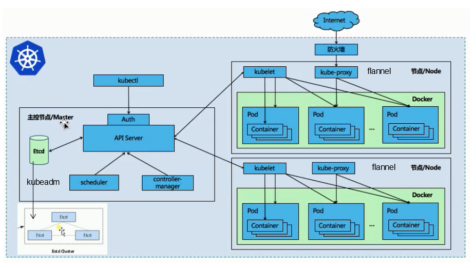 (2).master和node交互使用node join,node与pod交互使用flannel网络。