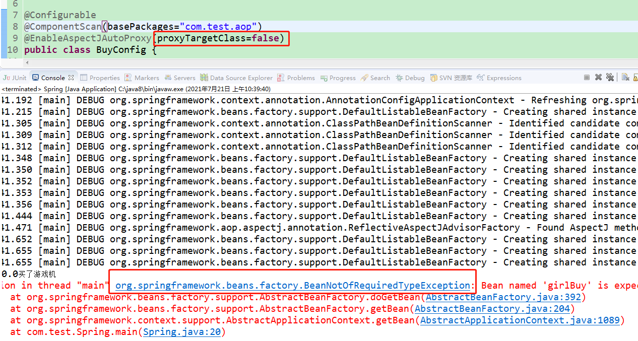 Bean named 'girlBuy' is expected to be of type 'com.test.aop.GirlBuy' but was actually of type 'com.sun.proxy.$Proxy19'